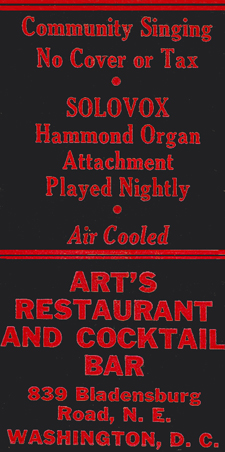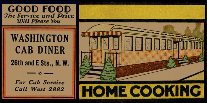 The Cab Diner, which opened in 1938, sat at right angles to the sidewalk along one edge of a gas station plaza at 2610 E Street NW. Although it had a relationship to the Washington Cab Association, whose office was around the corner on 26th Street, it was a family affair under the proprietorship of Carleton Brown and his wife Beulah, who was still running the enterprise in the late 1950s.