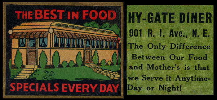 Today 's average Washingtonian would have difficulty visualizing the Cab Diner's Foggy Bottom riverfront neighborhood. Peter Penczer's Washington Then And Now photograph shows these blocks around the Heurich Brewery's castle-on-the-Rhine plant as leafy and unpopulated, lacking the familiar curbside ribbons of parked cars even in 1950. But as his text notes, Foggy Bottom was quite industrial, with square blocks devoted to the brewery and the huge storage tanks of the Washington Gas Works. The brewery's eastern battlements faced the original NIH headquarters on the Naval Hospital grounds across 25th Street NW. Even in the 1930s, the briddle path along the Potomac shore attracted several large stables and riding academies, and at least one of the local ice plants followed the Uline Arena example and opened an indoor skating rink. The DC Public Schools football championship was decided annually at Riverside Stadium, which stood on the riverbank near 26th and D Streets into the 1950s.