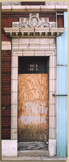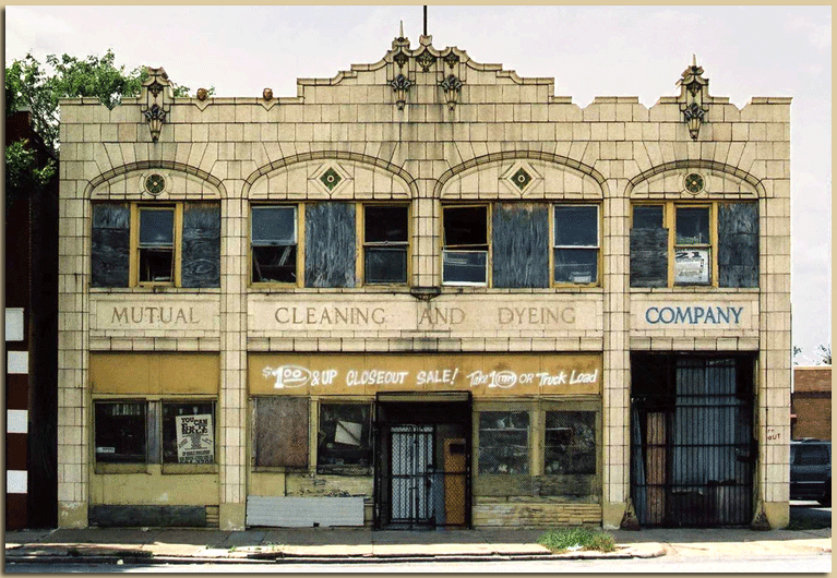 BOTTOM: During the 1920s, terra cotta broke out of its classical motifs and became popular as glazed polychrome tile. Many factories of the era used terra cotta tile facades to suggest that they were bright, clean, and modern, with no connection to the dim, dismal, Dickensian brick Victorian workhouse. It is particularly fitting that the old Mutual Cleaning Company plant on Martin Luther King Avenue is faced with this material and particularly ironic that it now appears to need a serious cleaning itself.